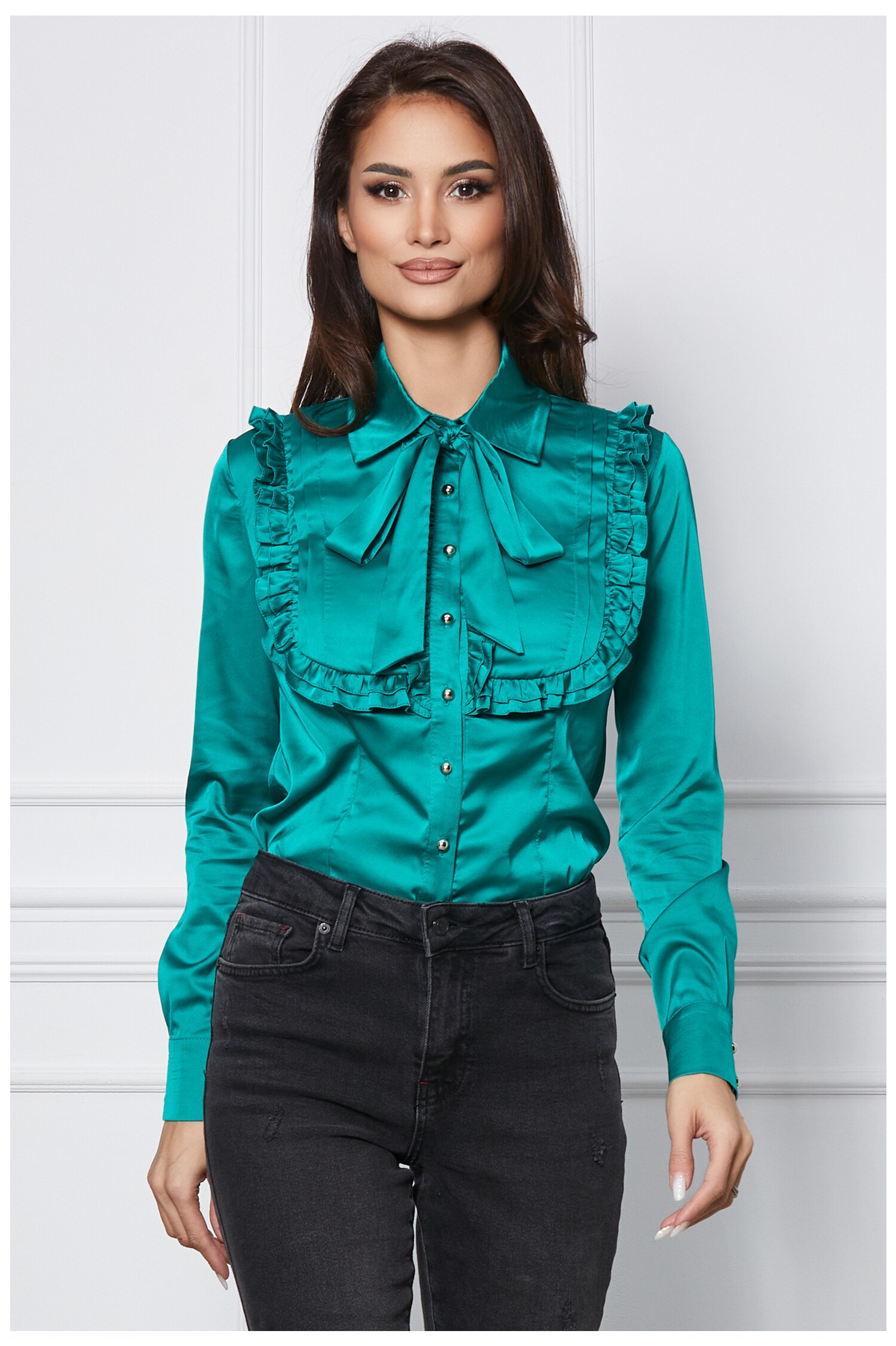 Camasa eleganta din satin cu volanase la bust si nasturi eleganti.? Camasa eleganta satinata Guler ascutit Volanase la bust Maneci lungi cu mansete Croi cambrat pe talie Inchidere cu nasturi? Material: Satin Compozitie:95% Poliester, 5% Elastan Instructiuni de intretinere:? ? ? ? ? *Va rugam verificati eticheta produsului inainte de curatare! *Modelul are inaltimea de 174 cm. *Va rugam sa retineti ca o usoara discrepanta de culoare ar trebui sa fie acceptabila datorita luminii si luminozitatii ecranului. *Va rugam verificati ghidul de marimi, in cm, pentru a alege corect marimea.