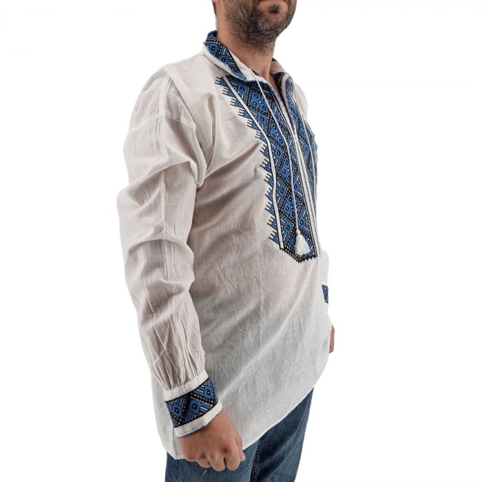Ie traditionala barbateasca, cu broderie in forme geometrice de culoare neagra, cusuta mecanic pe panza de bumbac de culoare alba.