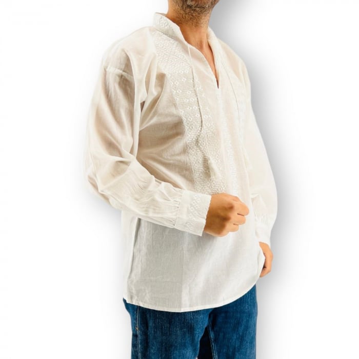 Camasa traditionala barbateasca, cu broderie de culoare alba, inspirata din folclor, cusuta mecanic pe panza de bumbac de culoare alba.