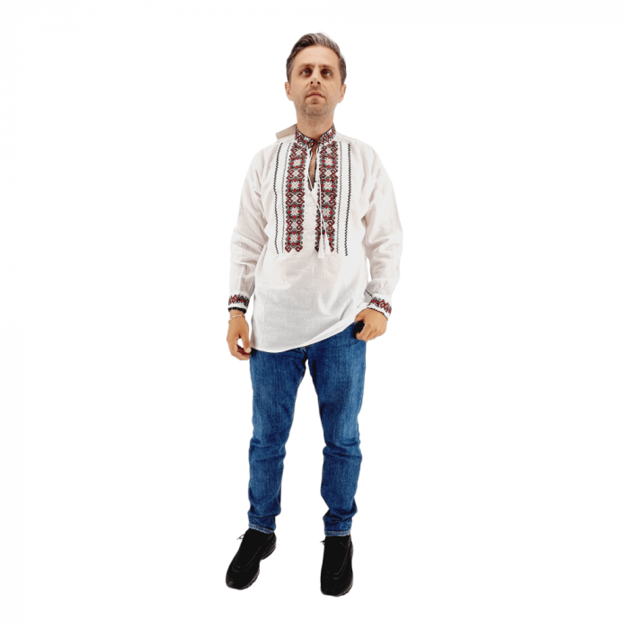 Camasa Traditionala Leonard, cu broderie multicolora, cu motive florale, inspirata din folclor, cusuta mecanic pe panza de bumbac de culoare alba.