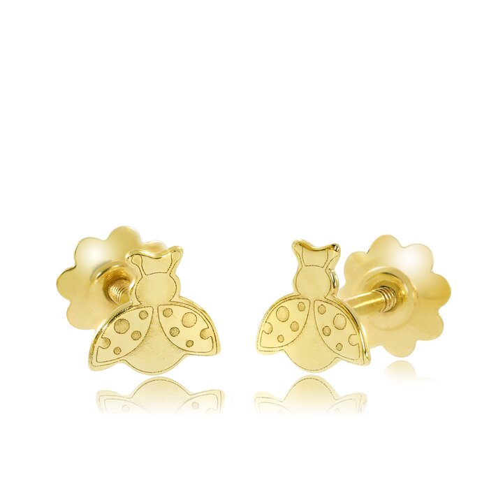Specification: Cercei copii/bebe – Model buburuza – Aur Galben 14K – Inchizatoare sigura si confortabila cu filet