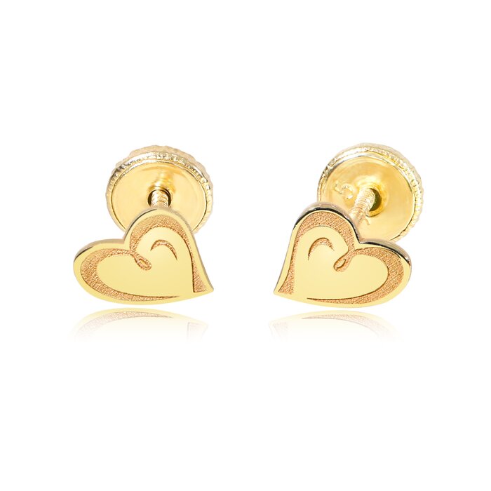 Specification: Cercei copii/bebe – Model inima conturata – Aur Galben 9K – Inchizatoare sigura si confortabila cu filet