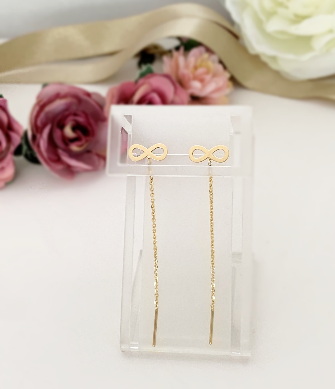 Specification: Cercei din aur galben 14k cu model infinit si lantisor