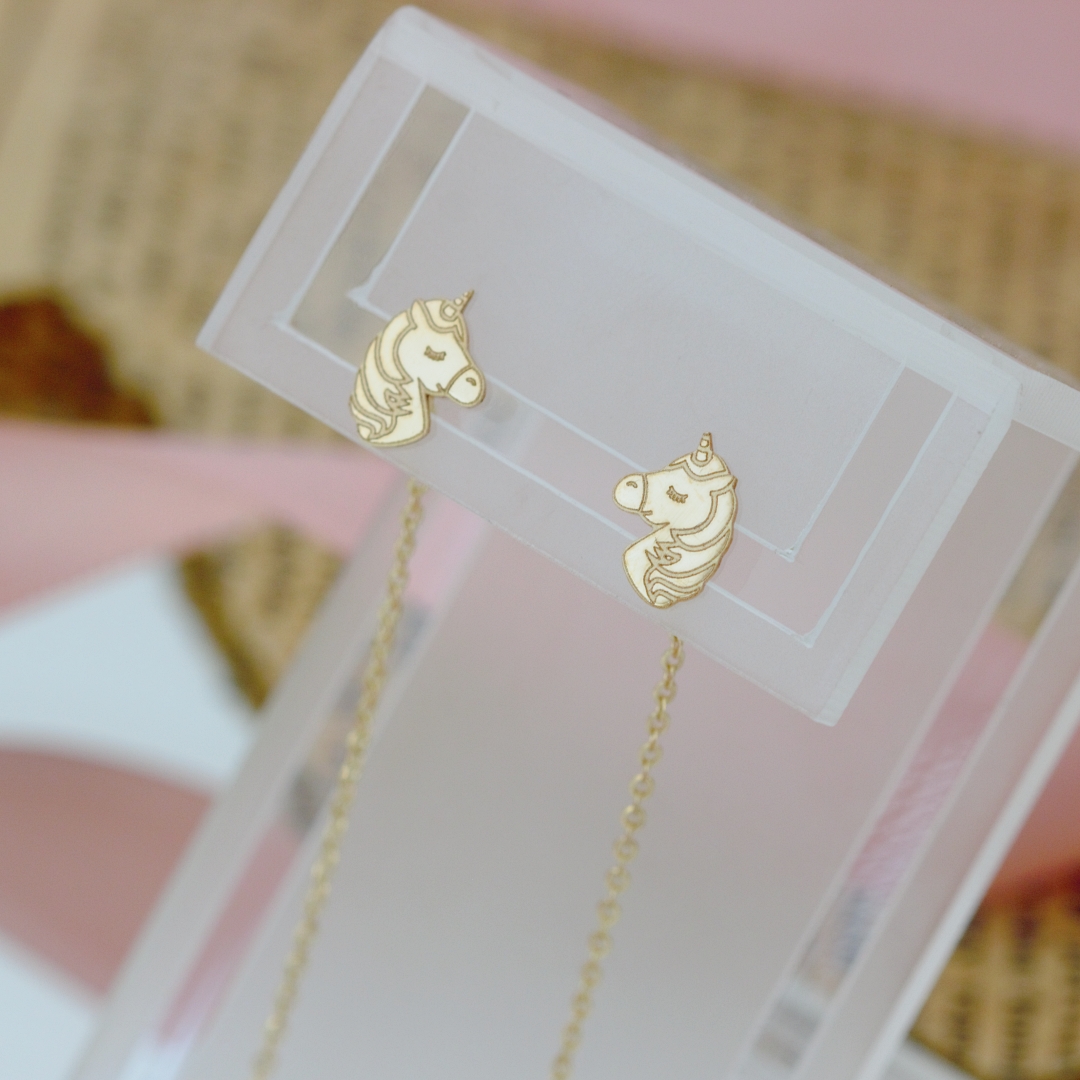 Cercei din aur galben, alb sau roz 14K model unicorn cu lant! Ambalaj PREMIUM! Certificat de autenticitate! CADOU la comenzi peste 299lei! Transport gratuit* in toata tara!