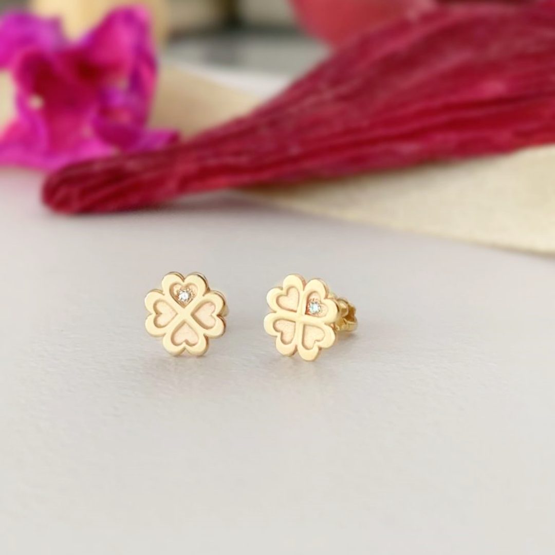 Cercei pentru bebe si fetite din aur galben 14K model trifoi cu diamant