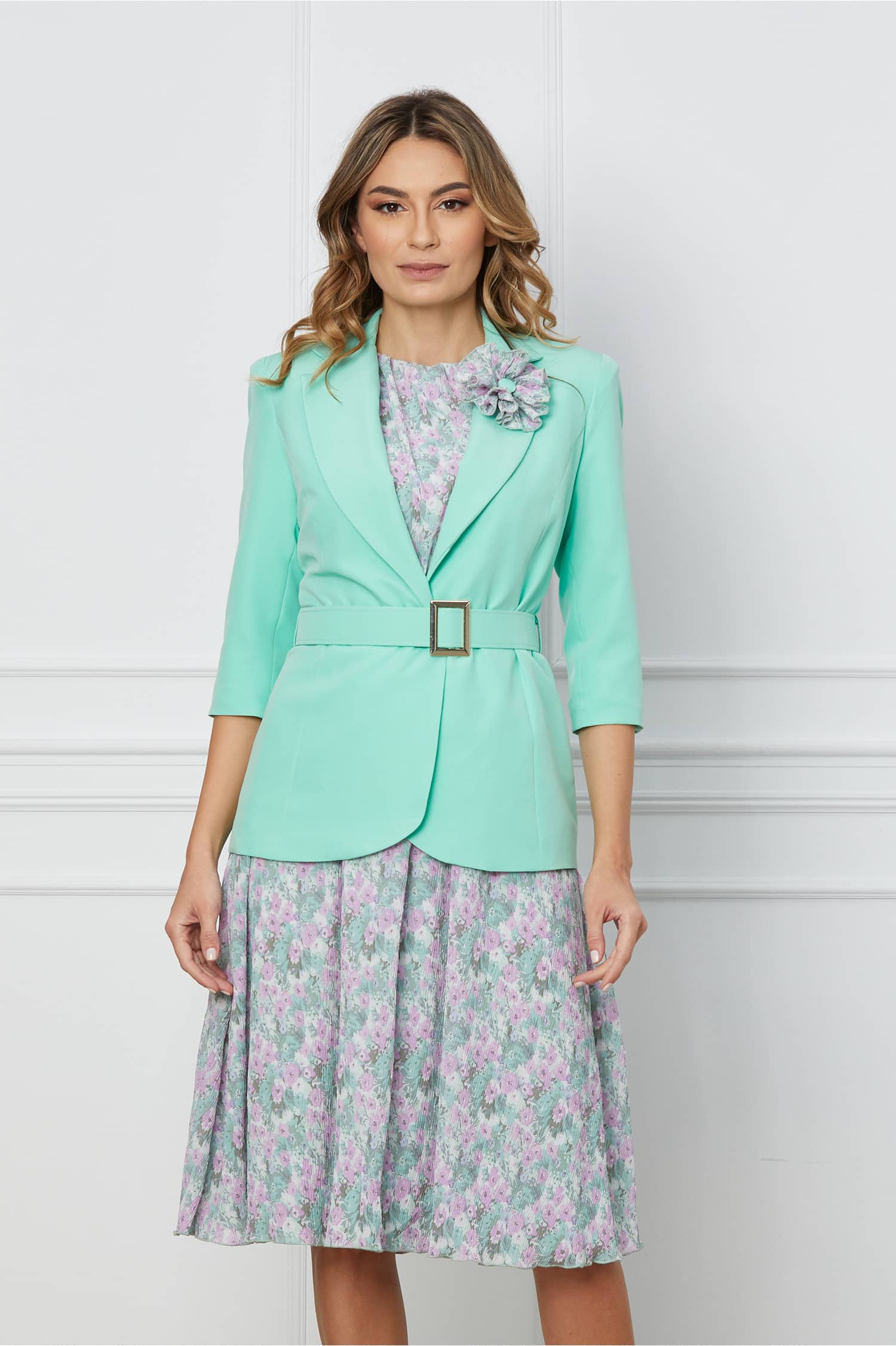 Specification: Compleu Dy Fashion verde mint cu sacou si rochie cu flori