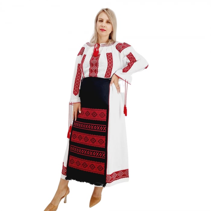 Fote traditionala romaneasca pentru femei, cu motive florale. Broderie rosu brodata la razboi pe stofa de lana de culoare neagra