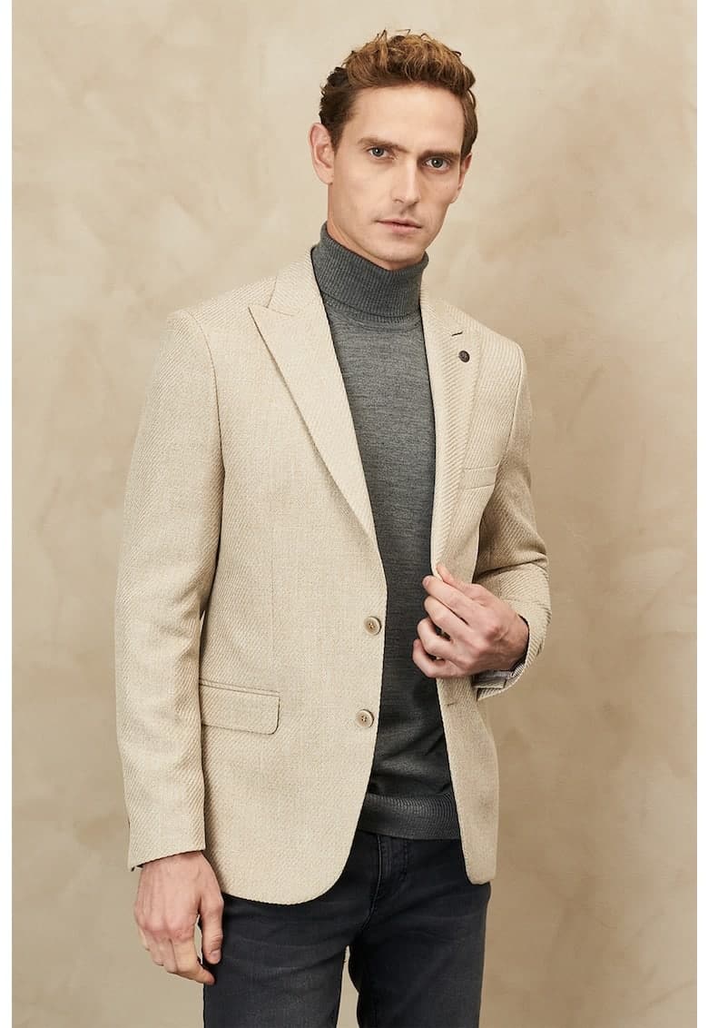 Caracteristici Culoare: bej deschis Imprimeu: uni Material: poliester Stil: elegant Croiala: regular fit Guler: cu revere decupate Lungime maneca: maneca lunga Buzunare: 2 cu clapa – unul cu refilet Sistem inchidere: nasturi Compozitie Exterior: 100% poliester