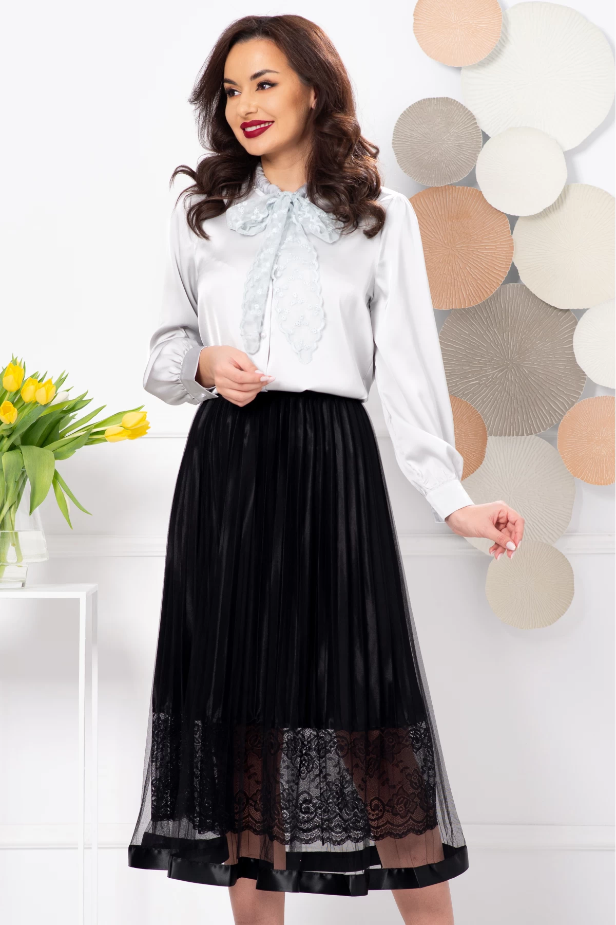 Specification: Fusta midi plisata neagra din tulle cu insertie din dantela