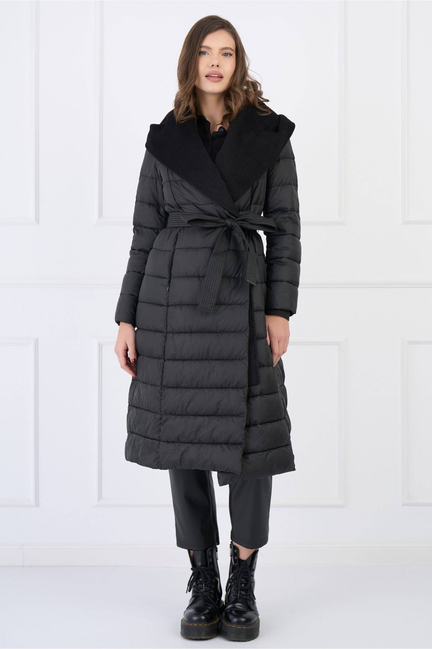Geaca din fas lunga neagra cu cordon in talie! La acest produs ai transport si retur/schimb gratuite! Livrare in Easy Box!