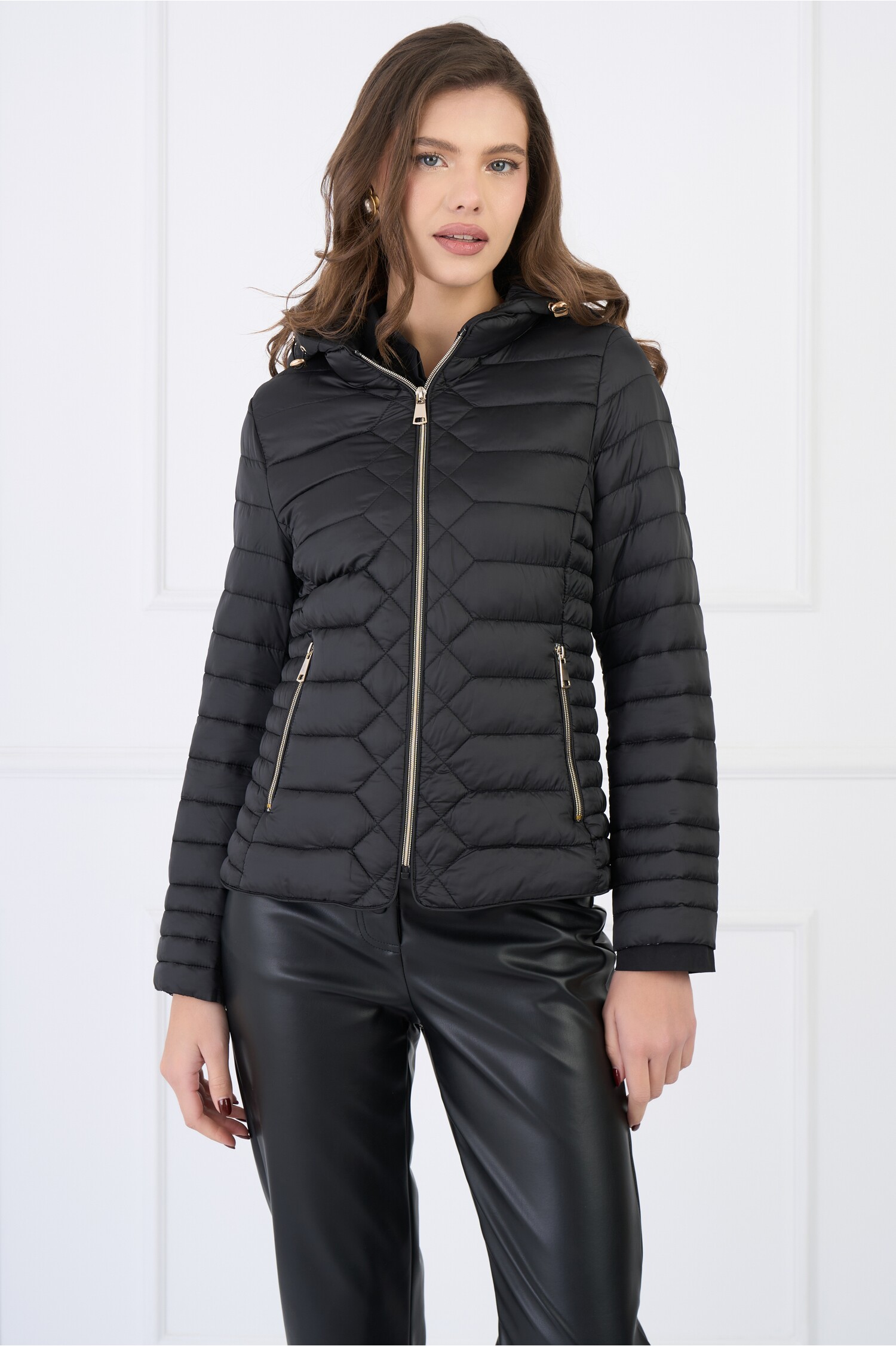 Geaca din fas neagra matlasata cu gluga! La acest produs ai transport si retur/schimb gratuite! Livrare in Easy Box!