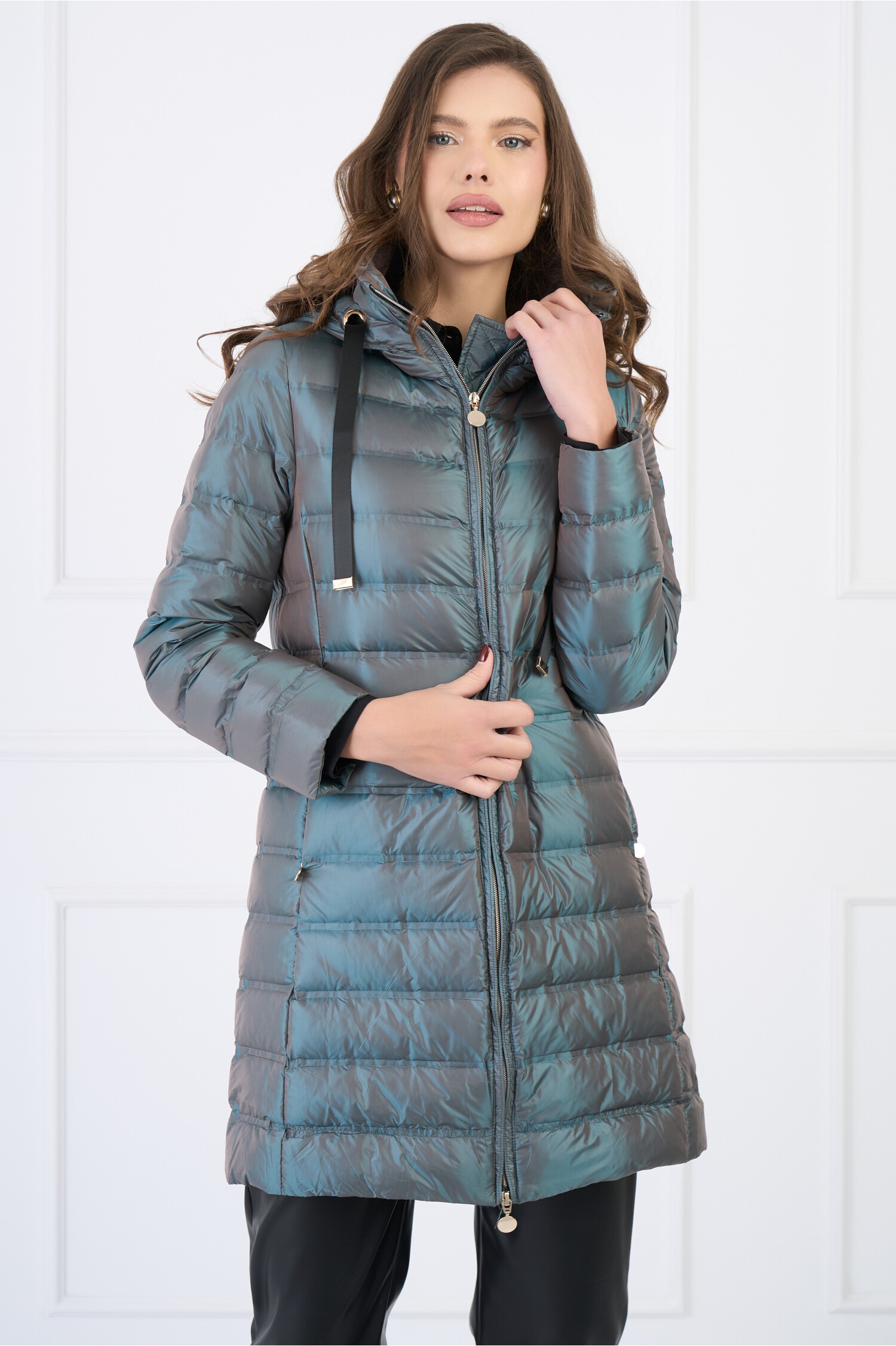 Specification: Geaca din fas turcoaz metalizat cu gluga si buzunare ascunse
