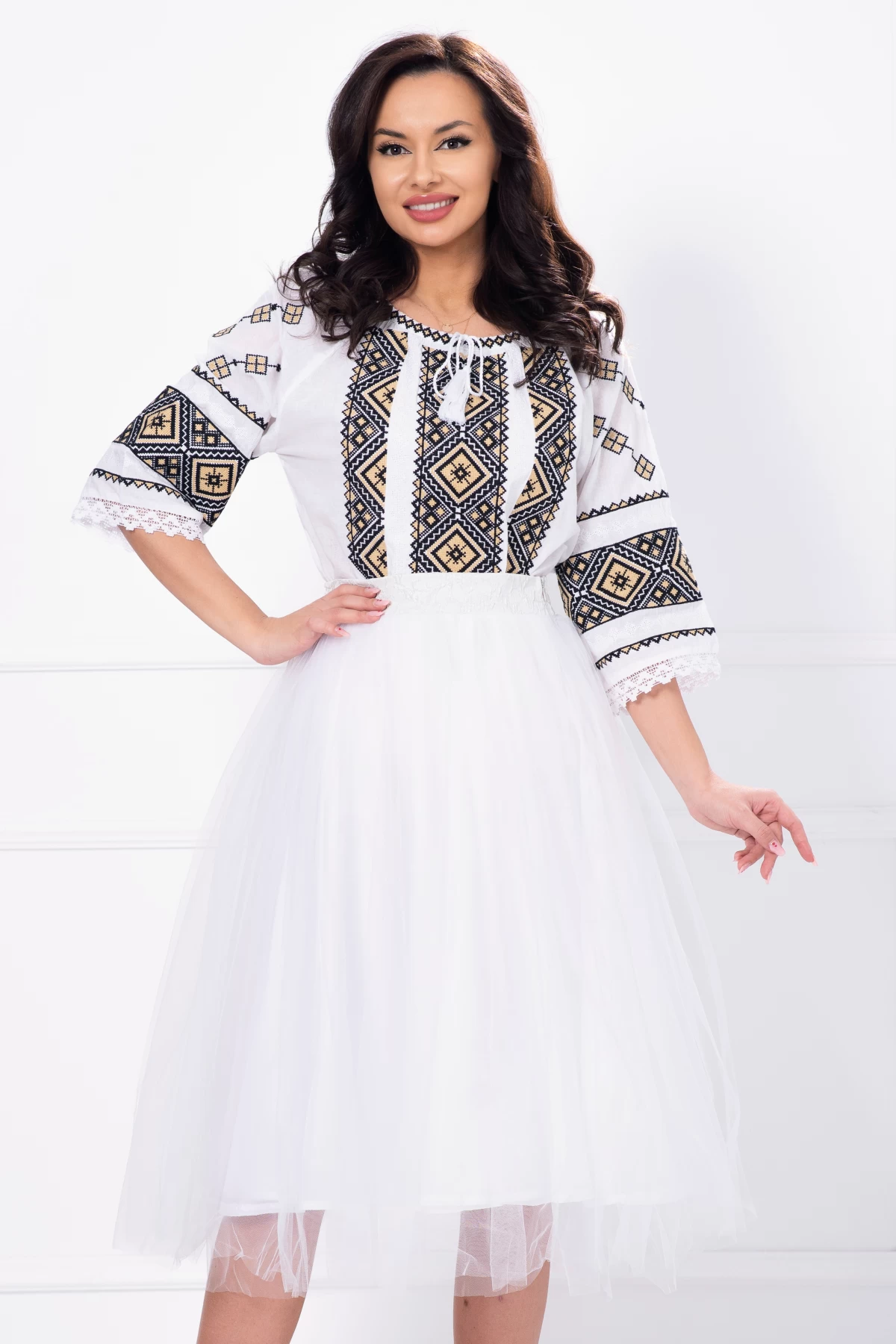 Ie dama traditionala brodata cu simbolui rombului Culoare: albCroi: dreptManeci trei sferturiDecolteu rotundSnur cu ciucuri albi la baza gatuluiBroderie traditionala cu simbolul rombului negru-auriuBanda din broderie alba cusuta cu fir de bumbac la terminatia maneciiCompozitie: 100% bumbac* Echipa noastra face toate eforturile in a prezenta cat mai bine culorile produselor prezentate pe site insa culorile pot diferi de situatia reala si pot varia ?n functie de setarile monitorului/dispozitivului dvs!