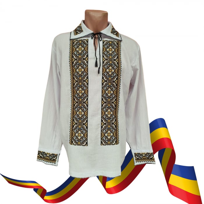 Ie traditionala barbateasca, cu broderie de culoare crem, testuta in 5 randuri si iesita in relief, pe panza de bumbac de culoare bleumarin.