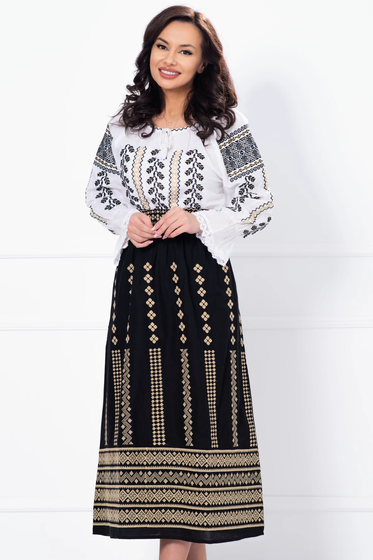 Ie traditionala Iasmina brodata cu simbolul frunzei si fir aurit Culoare: alb negruauriuCroi: lejerManeci lungi Mansete elasticeDecolteu rotundVolan tip clopot la terminatia maneciiInchidere cu snur cu ciucuri la baza gatuluiBroderie pretioasa cu simbolul frunzei si fir auritCompozitie: 100% bumbac* Echipa noastra face toate eforturile in a prezenta cat mai bine culorile produselor prezentate pe site insa culorile pot diferi de situatia reala si pot varia ?n functie de setarile monitorului/dispozitivului dvs!