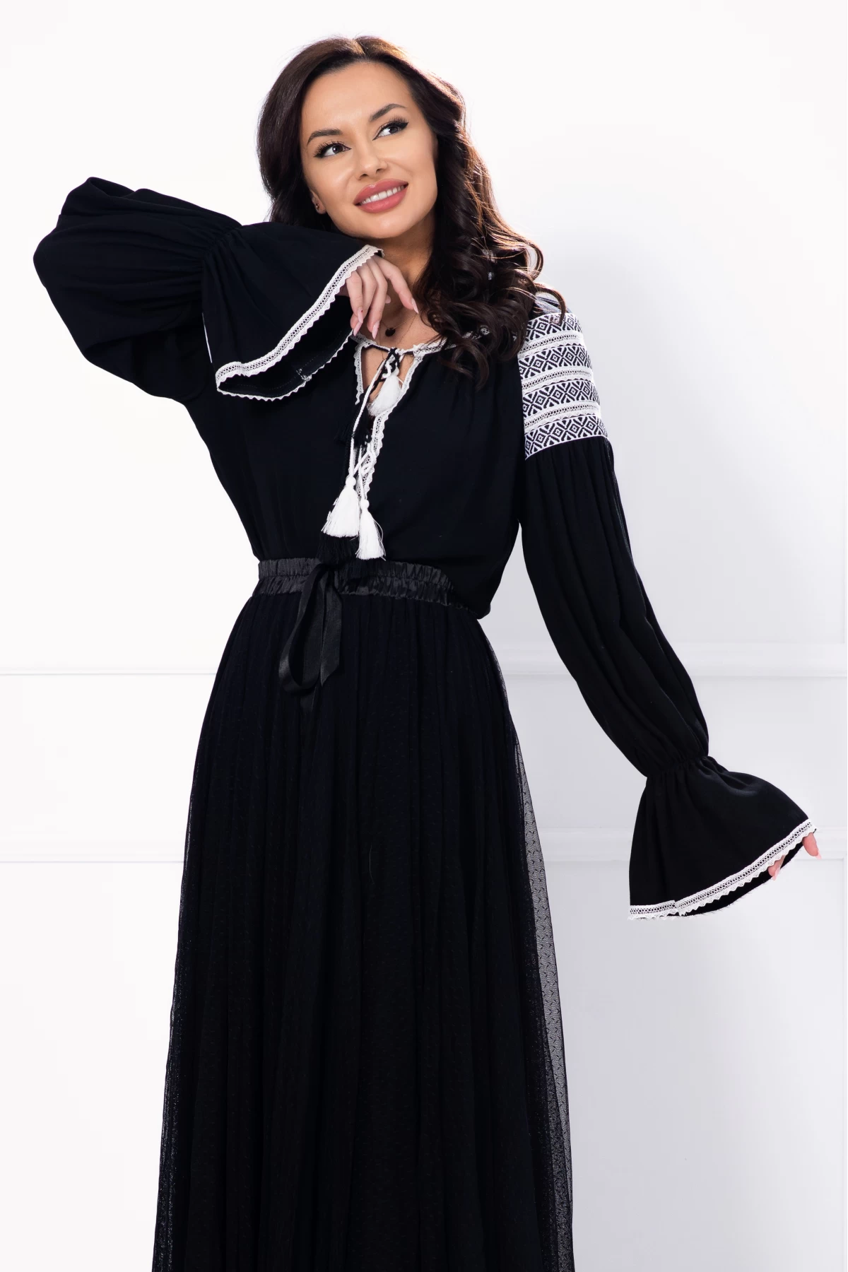 Ie traditionala neagra cu broderie alba Bluza lejera tip ie Culoare: negruManeca lunga cu elastic la manseteVolan la terminatia manecii cu broderie albaCroi lejer Snur alb-negru cu ciucuri la gatInsertii brodate din dantela de bumbacCompozitie: 65% vascoza 25% poliester 10% bumbacFabricat in Romania* Echipa noastra face toate eforturile in a prezenta cat mai bine culorile produselor prezentate pe site insa culorile pot diferi de situatia reala si pot varia ?n functie de setarile monitorului/dispozitivului dvs!