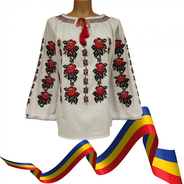 Ie traditionala romaneasca pentru femei, cu motive florale. Broderie rosu si negru brodata la razboi pe bumbac de culoare alba. Ie Traditionala Pemota nr 129