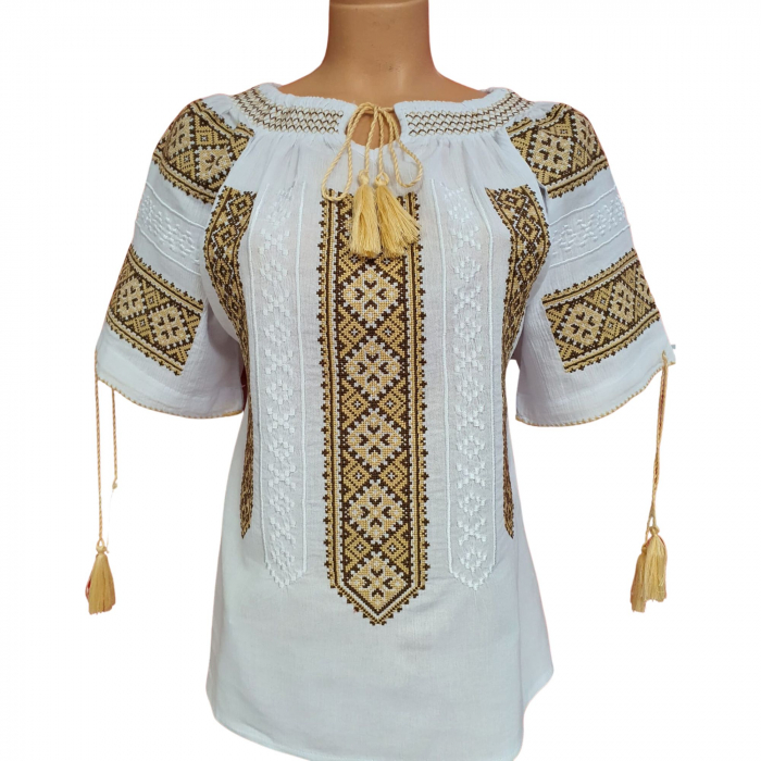 Ie traditionala romaneasca pentru femei, cu motive florale. Broderie rosu si negru brodata la razboi pe bumbac de culoare alba. Ie Traditionala Pemota nr 142