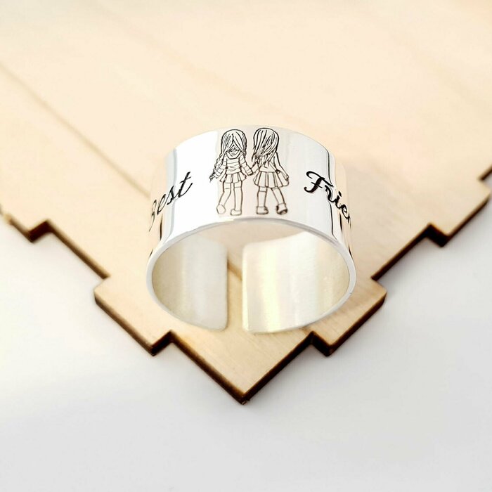 Prietenia este una dintre cele mai mari binecuvantari pe care le poti avea. Intalnim o multime de oameni in propria calatorie, dar sunt doar cateva persoane care isi lasa amprenta in viata noastra. Cea mai buna prietena este o astfel de persoana care a reusit sa aiba un impact pozitiv asupra vietii tale. Ce mai buna prietena este persoana care te intelege orice ai face, care iti ofera mereu un sfat, o mana, un umar de sprijin si alaturi de care te vei simtii mereu confortabil sa fi tu.?? Marcheaza propria prietenie cu un inel personalizat cu gravuara a 2 fete ce se tin de mama si cu textul Best friends impartit pe laterale. Ofera inelul celei mai bune prietene si arata-i cat de mult inseamna pentru tine.? Despre produs: Inelul este creat din Argint 925. Latimea lui este de 11 mm. Textul gravat poate fi modificat la cerere. De exemplu, se poate grava cate un nume pe laterale, reprezentand numele celor doua fete. Bijuteria poate fi placata cu Aur Galben sau Roz de 18k.?? Gramaj aproximativ ARGINT 925:5.47 grame Aceasta bijuterie personalizata este realizata de la zero pentru fiecare comanda in parte.? Dupa plasarea si confirmarea comenzii incepe procesul ei de creatie: ? Realizare Design -> Taiere/Personalizare -> Finisare manuala -> Polish Final -> Ambalare -> Livrare! Datorita procesului de productie si a personalizarii bijuteriei dupa propria dorinta gramajul final al produsului poate fi diferit. Din acest motiv pe site este afisat gramajul obtinut prin catarirea produsului realizat in pozele de prezentare. Pretul produsului include pe langa costul gramului de Argint 925 si tot procesul de mai sus, necesar pentru realizarea unui produs cu adevarat special pentru tine. ? Toate produsele din Argint 925 comercializate de Chic Bijoux sunt marcate cu titlul Argintului? 925 ? ? ? *** Inelul este reglabil, insa pentru o potrivire cat mai perfecta te rugam sa notezi marimea inelului. *** Daca nu stii care e marimea ta sau a persoanei careia doresti sa ii faci cadou inelul, articolul Cum afli corect marimea inelului tau? ?de pe blogul Chic Bijoux iti vine in ajutor. ? Dupa plasarea comenzii veti fi contactat de o colega din echipa Chic Bijoux pentru toate detaliile necesare personalizarii produsului.