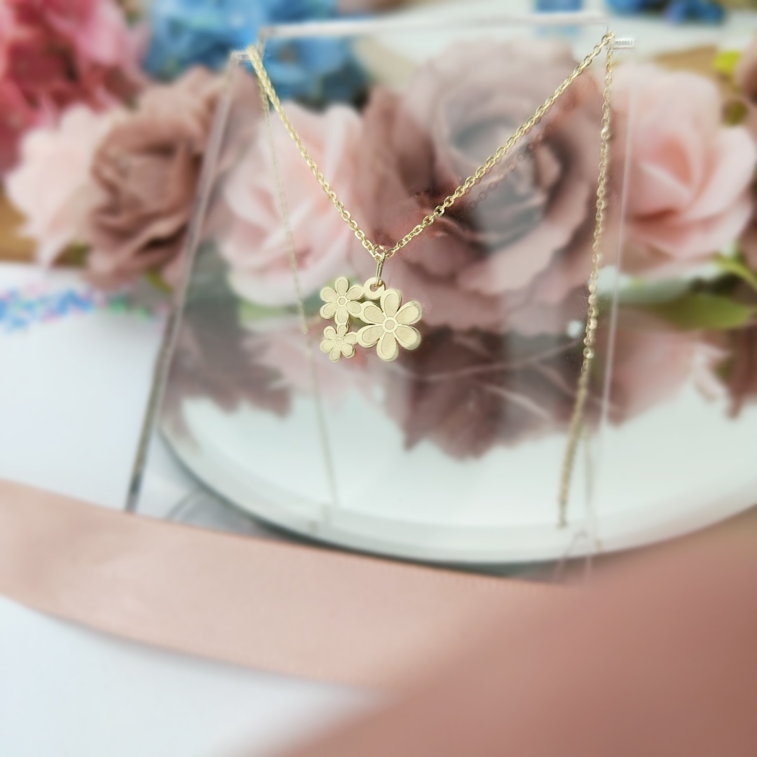 Specification: Lantisor cu pandantiv trei floricele – aur galben, alb sau roze 14K