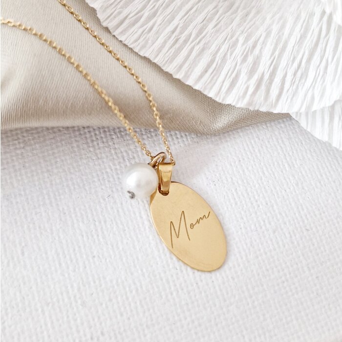 Lantisor cu picatura de Perla – Model pandantiv oval MOM – Aur Galben 14K