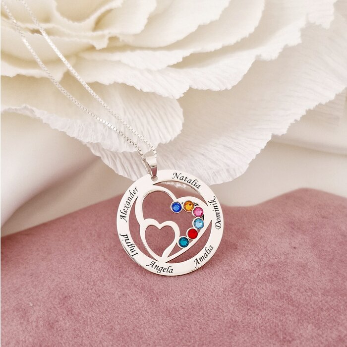 Lantisor Familie unita – Inimi in disc – 6 nume si cristale Swarovski – Argint 925