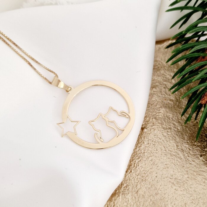 Lantisor festiv – Feline în Noapte – Pandantiv pisici si stea – Argint 925 placat cu Aur Galben 18K