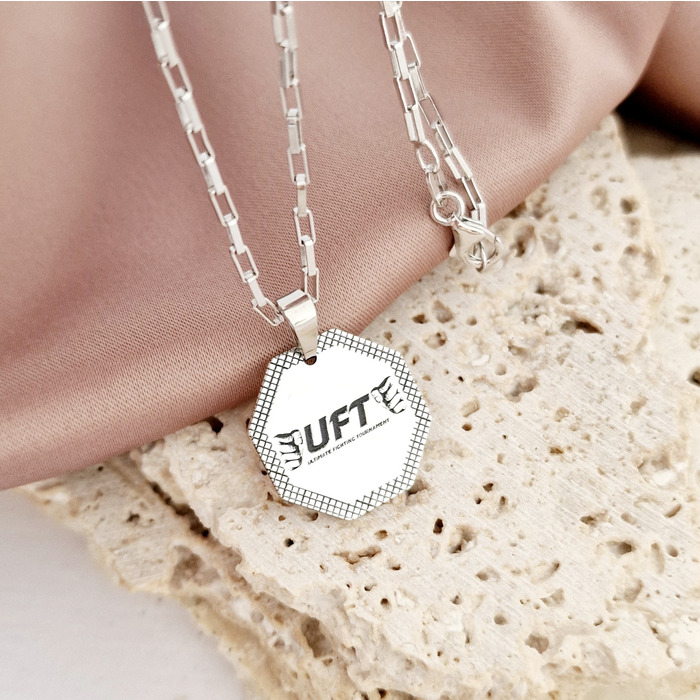 UFT (Ultimate Fighting Tournament) reprezinta o competitie de lupte extrem de intense si spectaculoase, in care luptatorii din diverse discipline de arte martiale se confrunta pentru a demonstra abilitati impresionante si rezistenta in fata adversarilor. In parteneriat cu brandul oficial UFT , am creat o colectie de bijuterii speciala, dedicata sustinatorilor si luptatorilor. Aceasta colectie unica de bijuterii reflecta valorile si energia UFT – putere, perseverenta si curaj. Fiecare piesa din colectie este creata cu atentie la detalii si ofera sustinatorilor o modalitate de a-si arata sprijinul si pasiunea pentru acest eveniment sportiv fascinant. Indiferent daca sunt purtate la evenimentele UFT sau in viata de zi cu zi, bijuteriile reprezinta o expresie a individualitatii si a atasamentului fata de valorile pe care UFT le promoveaza. DESPRE PRODUS: Pandantul in forma de octagon este creat din Argint 925. Acesta are dimensiunea de 20 mm. Pandantul vine atasat unui lant din Argint 925 de 54 cm. Bijuteria este livrata in ambalaj premium Chic Bijoux, impreuna cu certificatul de calitate ce atesta autenticitatea materialelor folosite. Important: acest produs poate fi realizat la comandă și din Argint 925 placat cu Aur de 18K, Aur de 9K sau Aur de 14K. Noul preț se va calcula în momentul confirmării comenzii. Gramaj aproximativ ARGINT 925: 7.6 grame Aceasta bijuterie personalizata este realizata de la zero pentru fiecare comanda in parte. Dupa plasarea si confirmarea comenzii incepe procesul ei de creatie: Realizare Design -> Taiere/Personalizare -> Finisare manuala -> Polish Final -> Ambalare -> Livrare! Datorita procesului de productie si a personalizarii bijuteriei dupa propria dorinta gramajul final al produsului poate fi diferit. Din acest motiv pe site este afisat gramajul obtinut prin catarirea produsului realizat in pozele de prezentare. Pretul produsului include pe langa costul gramului de Argint 925 si tot procesul de mai sus, necesar pentru realizarea unui produs cu adevarat special pentru tine. Dupa plasarea comenzii veti fi contactat de o colega din echipa Chic Bijoux pentru toate detaliile necesare personalizarii produsului. Toate produsele din Argint 925 comercializate de Chic Bijoux sunt marcate cu titlul Argintului · 925 ·