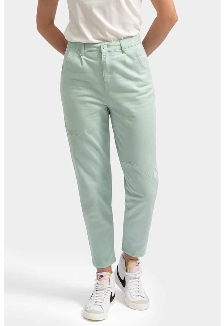 Caracteristici Culoare: verde menta Stil: casual Material: bumbac – elastan Imprimeu: uni Croiala: conica Lungime: crop Talie: inalta Detalii: bucle pentru curea – detalii cusute Buzunare: 2 aplicate – pe partea din spate – 2 oblice Sistem inchidere: nasturi Compozitie Exterior: 98% bumbac – 2% elastan