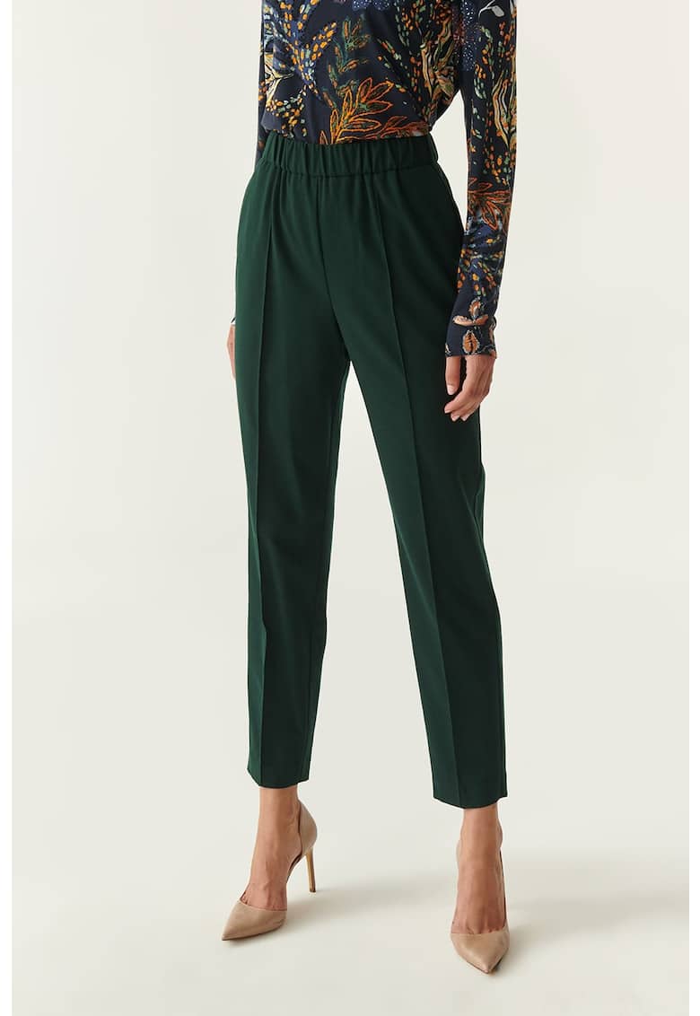 Caracteristici Culoare: verde englez Stil: casual Material: sintetic Imprimeu: uni Croiala: regular fit – conica Lungime: crop Talie: inalta Detalii: banda elastica in talie – pliuri in partea din fata Buzunare: 2 oblice Sistem inchidere: fara inchidere Compozitie Exterior: 65% poliester – 33% viscoza – 2% elastan