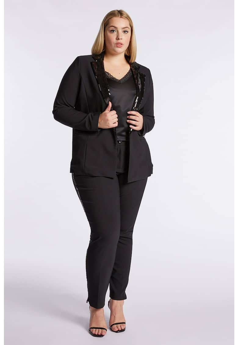 Caracteristici Culoare: negru Stil: elegant Material: sintetic – viscoza Imprimeu: uni Croiala: curvy Lungime: lungi Talie: medie Detalii: pensa – aplicatii cu paiete in partile laterale – acest produs se adreseaza femeilor cu forme pline (plus size). Buzunare: 2 laterale Sistem inchidere: fermoar Compozitie Exterior: 61% viscoza – 31% poliamida – 8% elastan