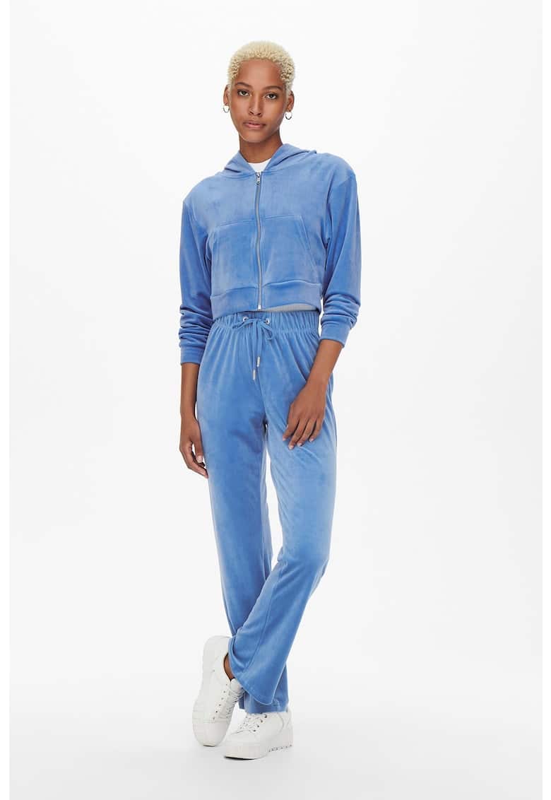 Caracteristici Culoare: albastru pastel Stil: casual Material: sintetic Imprimeu: uni Croiala: regular fit Lungime: lungi Talie: medie Detalii: aspect catifelat – talie ajustabila – cu snur Sistem inchidere: fara inchidere Compozitie Exterior: 96% poliester – 4% elastan