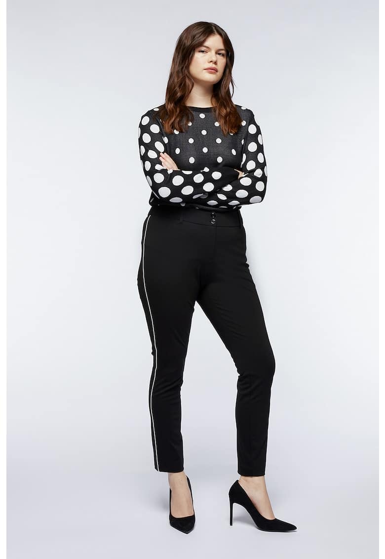 Caracteristici Culoare: negru Stil: casual Material: viscoza – poliamida Imprimeu: uni Croiala: curvy Lungime: lungi Talie: inalta Detalii: bucle pentru curea – acest produs se adreseaza femeilor cu forme pline (plus size). Sistem inchidere: fermoar Compozitie Exterior: 53% viscoza – 41% poliamida – 6% elastan