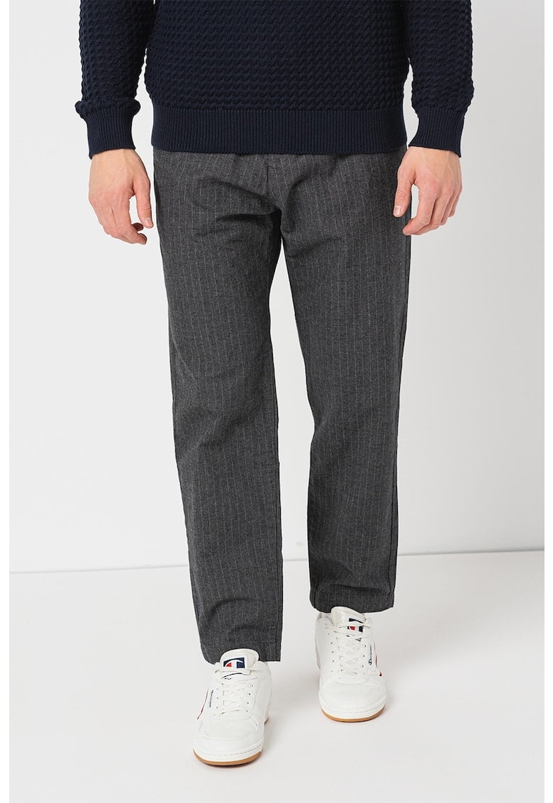 Caracteristici Culoare: gri inchis melange Imprimeu: dungi Material: bumbac Stil: casual Croiala: regular fit Talie: joasa Buzunare: 4 Lungime: lungi Detalii: talie ajustabila – cu snur Sistem inchidere: fara inchidere Compozitie Exterior: 99% bumbac – 1% elastan Info model Modelul poarta un produs de marimea W32-L32. Marimi model: 191 cm inaltime – 99 cm bust – 80 cm talie – 101 cm sold