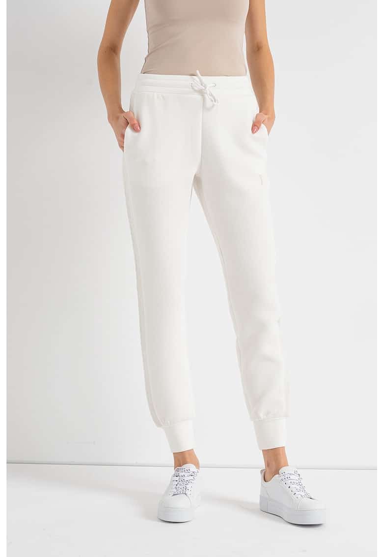 Caracteristici generale Tip produs: pantaloni Tip: lungi Stil: talie inalta Culoare: alb murdar Material: viscoza – elastan – poliamida – sustenabil Imprimeu: logo Sport: fitness Detalii: snur pentru ajustare in talie – aplicatie cu logo – segmente contrastante cu logo Detalii material Exterior: 77% viscoza – 15% poliamida – 8% elastan Info model Modelul poarta un produs de marimea S. Marimi model: 177 cm inaltime – 86 cm bust – 60 cm talie – 90 cm sold