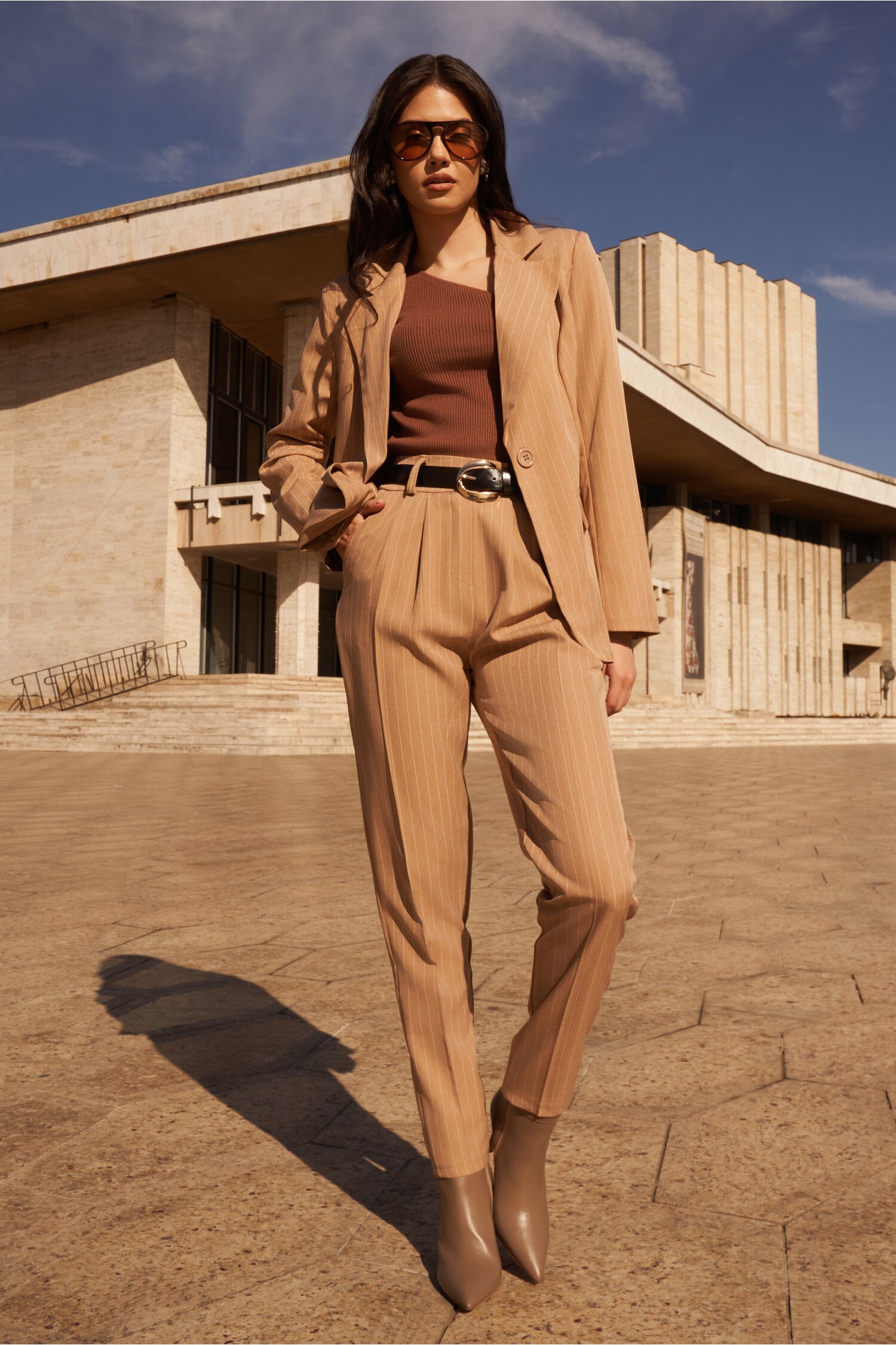Pantaloni cu dungi si curea detasabila in talie. Au talie inalta cu elastic la spate, pliuri, buzunare functionale, croi conic si se inchide cu fermoar si doi nasturi.? Pantaloni cu dunga Talie inalta Elastic in talie la spate Buzunare functionale Croi conic Inchidere cu nasturi si fermoar Material: Stofa Compozitie: 97% Poliester, 3% Elastan *Va rugam verificati eticheta produsului inainte de curatare! *Modelul are inaltimea de 170 cm. *Va rugam sa retineti ca o usoara discrepanta de culoare ar trebui sa fie acceptabila datorita luminii si luminozitatii ecranului. ? *Va rugam verificati ghidul de marimi, in cm, pentru a alege corect marimea.