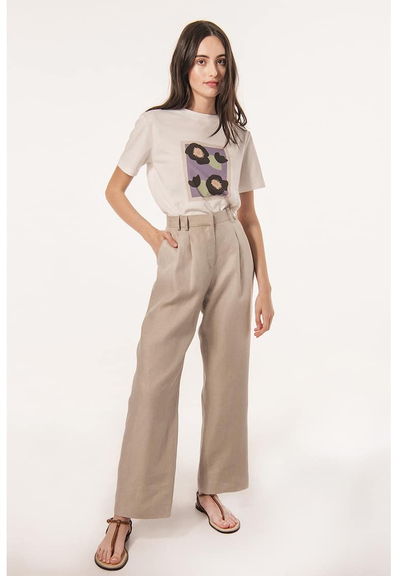 Caracteristici Culoare: maro nisip Stil: casual Material: in Imprimeu: uni Croiala: croiala ampla Lungime: lungi Talie: inalta Detalii: pliuri pe partea superioara frontala Buzunare: 2 laterale Sistem inchidere: fermoar Compozitie Exterior: 100% in