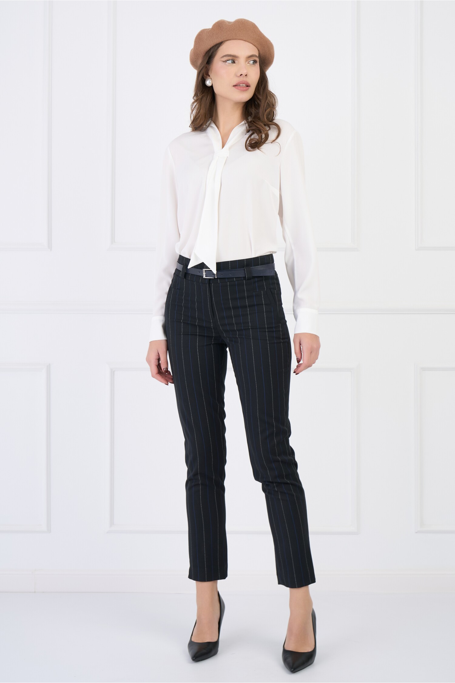 Specification: Pantaloni din stofa office negri cu dungi si curea in talie