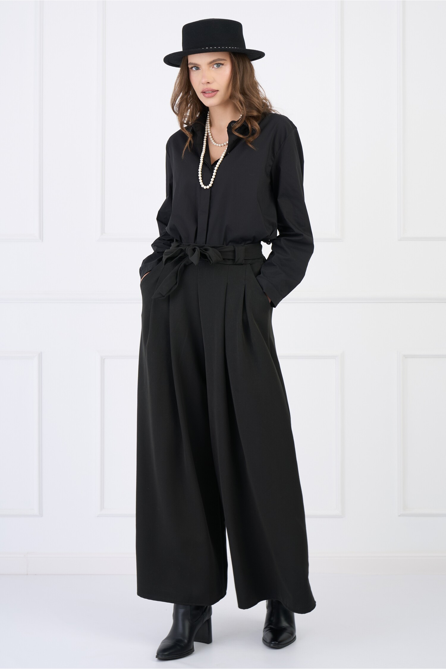 Pantaloni din stofa smart casual negri evazati cu buzunare si cordon