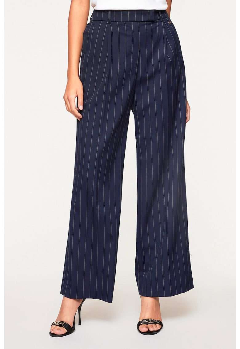 Caracteristici Culoare: albastru inchis Stil: casual Material: poliester – viscoza Imprimeu: dungi Croiala: croiala ampla Lungime: lungi Talie: inalta Detalii: bucle pentru curea Buzunare: 3 Sistem inchidere: fermoar Compozitie Exterior: 62% poliester – 37% viscoza – 1% elastan Captuseala: 95% poliester – 5% elastan