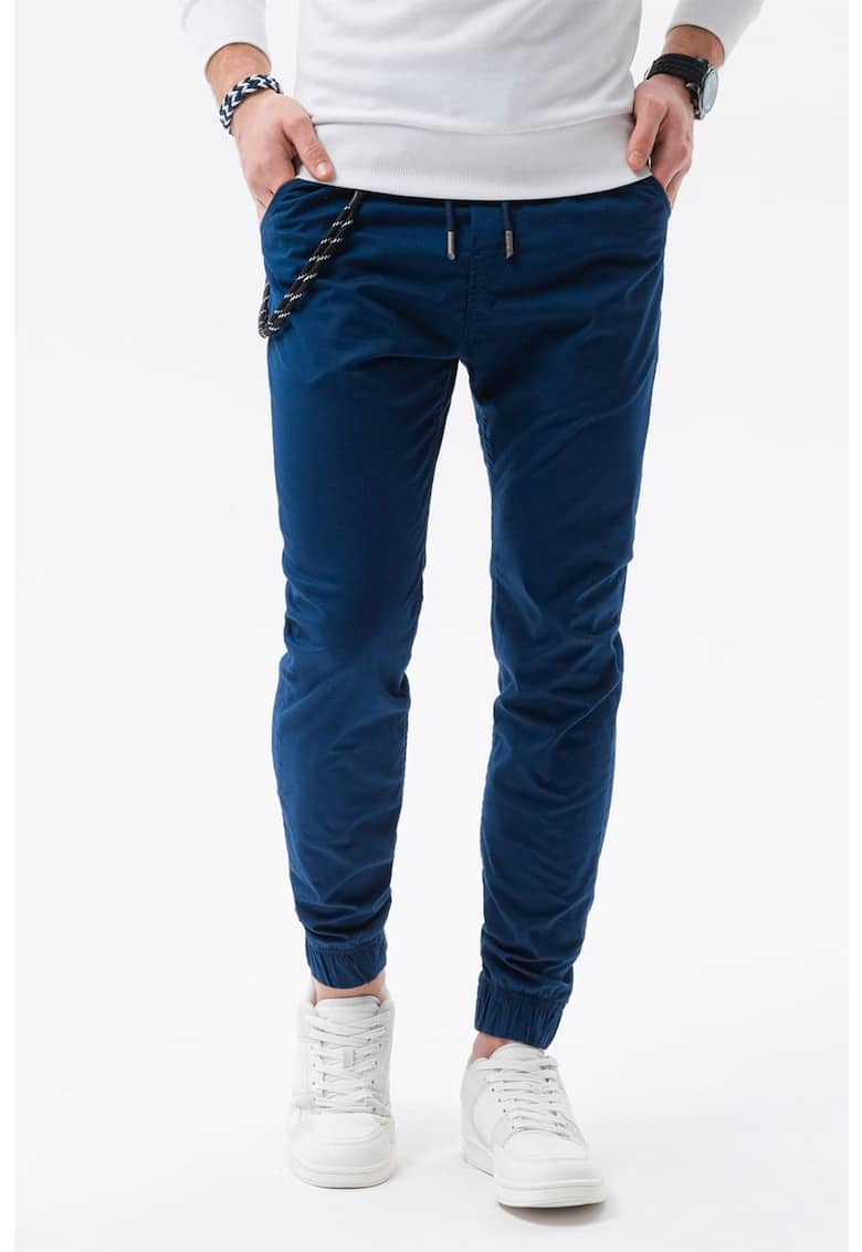 Caracteristici Culoare: bleumarin Imprimeu: uni Material: bumbac Stil: casual Croiala: conica Talie: joasa Buzunare: 4 Lungime: lungi Detalii: talie ajustabila – cu snur Sistem inchidere: fara inchidere Compozitie Exterior: 98% bumbac – 2% elastan
