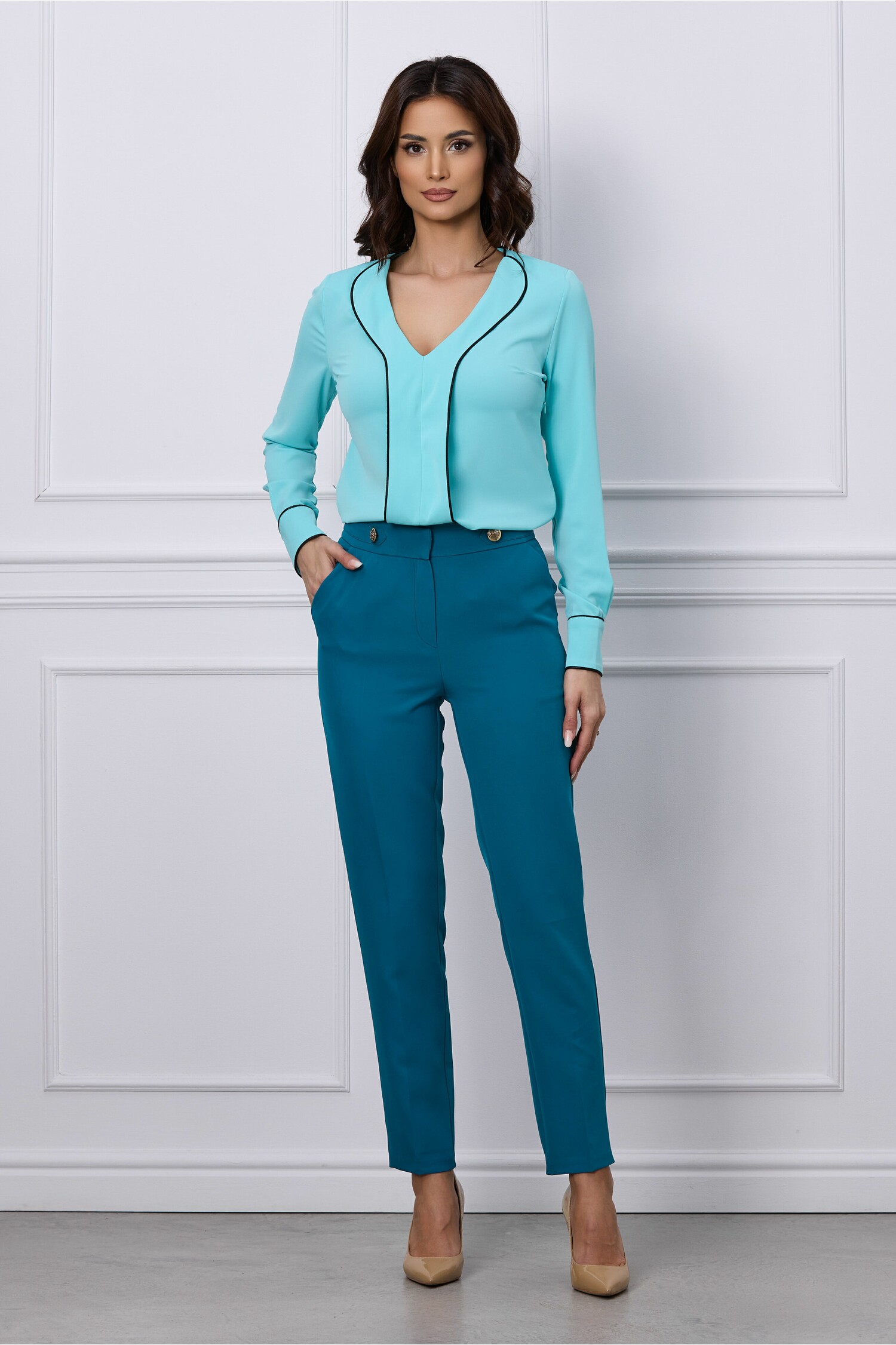 Pantaloni MBG turcoaz cu nasturi aurii decorativi