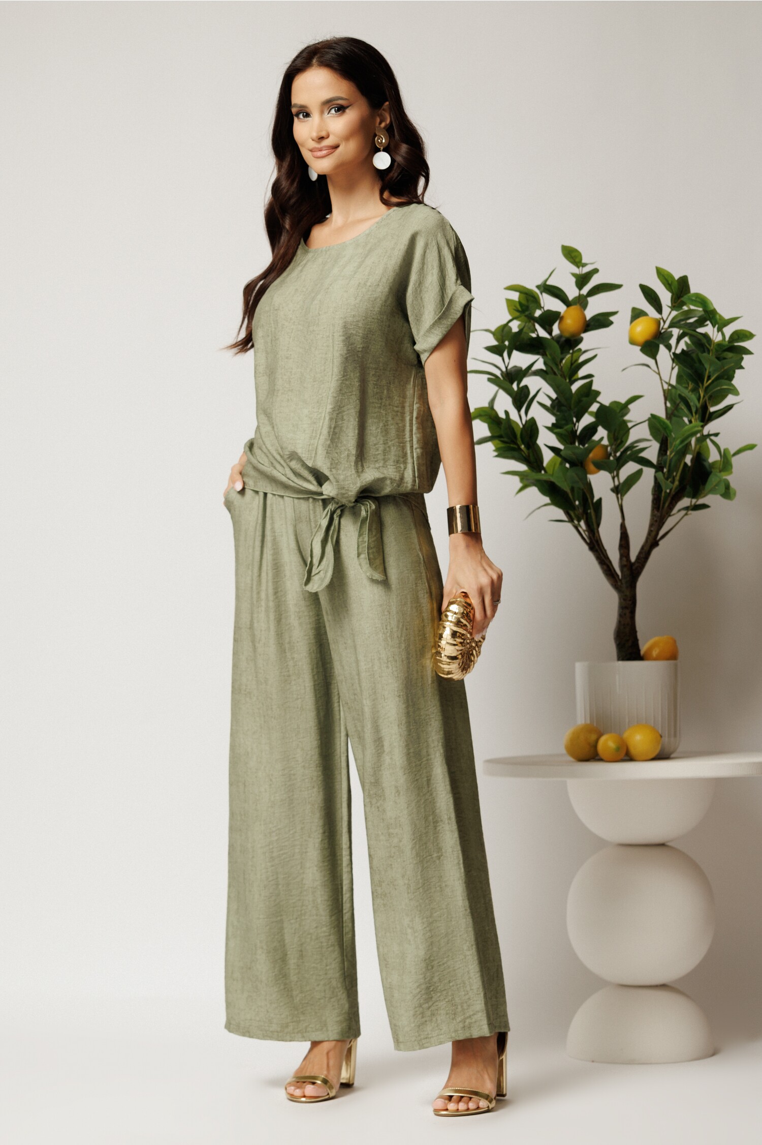 Pantaloni vede fistic din viscoza cu croi lejer si elastic in talie.