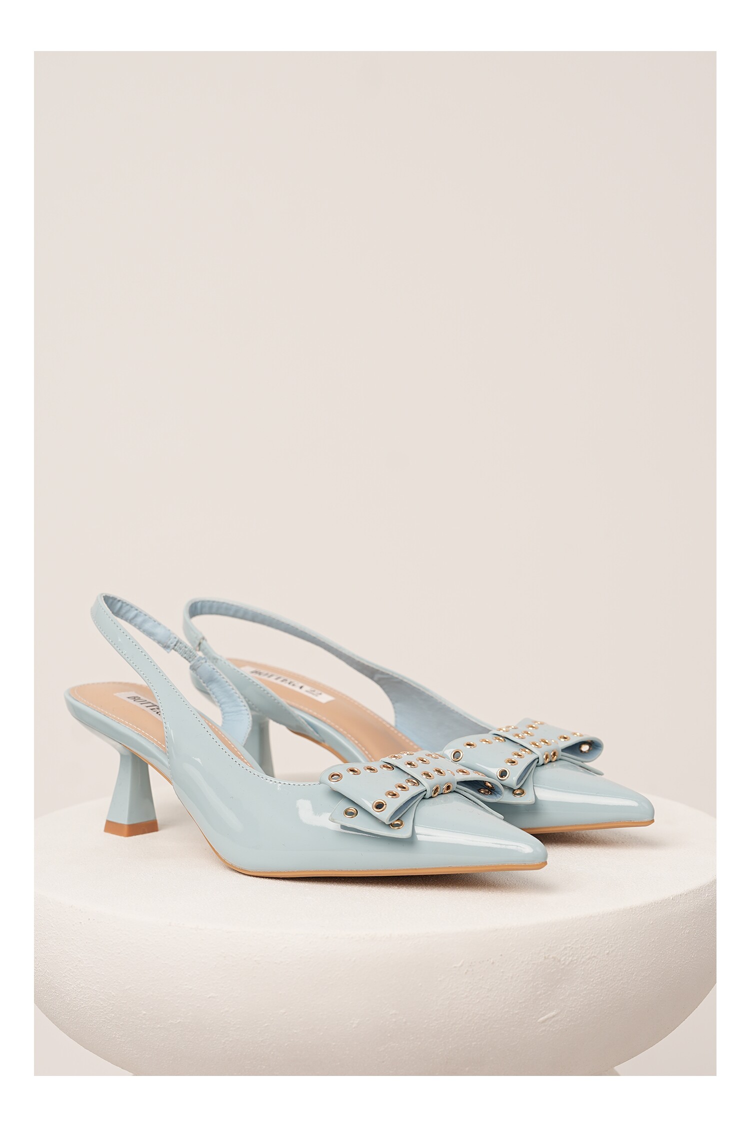 Pantofi bleu din piele ecologica lacuita cu funda si capse
