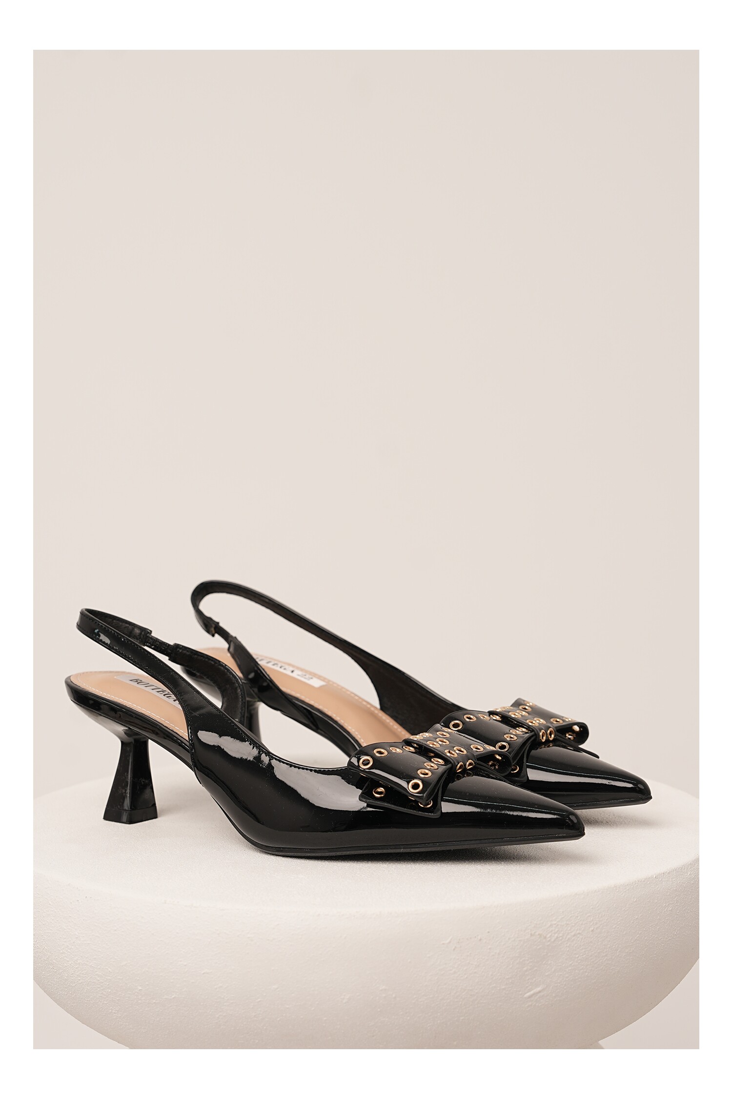Pantofi eleganti din piele ecologica lacuita acesorizati cu funda si capse pe varf. Au toc jos, bareta cu elastic si varf ascutit. Pantofi eleganti Varf ascutit Bareta cu elastic Toc jos Material: Piele ecologica lacuita Inaltime toc: 4 cm