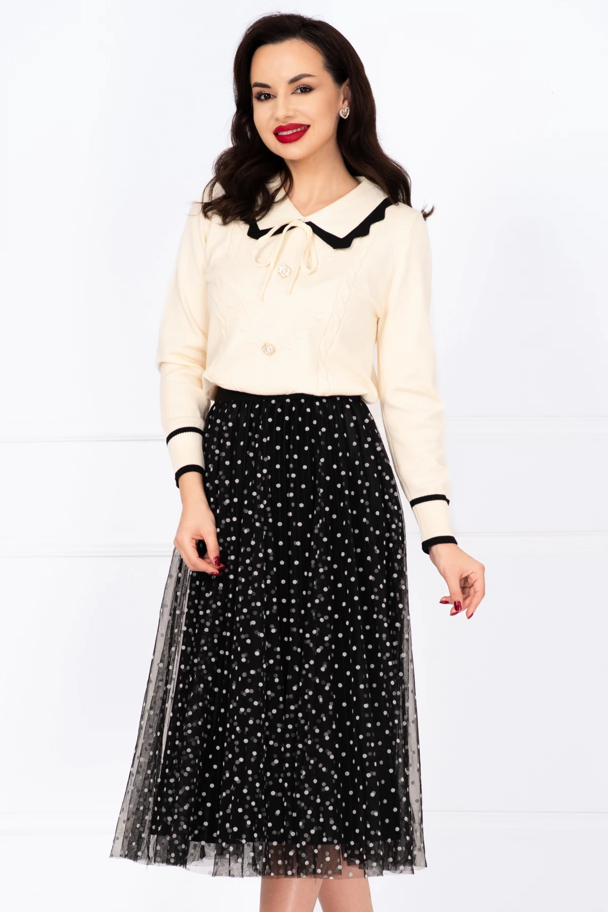 Specification: Pulover dama ecru din tricot Thea cu guler dublu si nasturi pretiosi