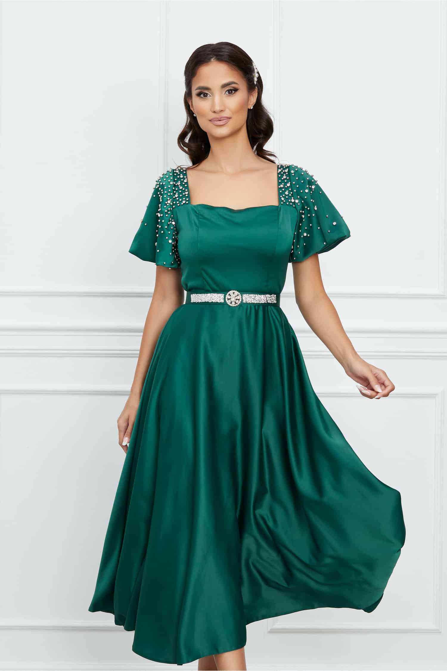 Be the first to review “Rochie Anastasia verde inchis cu accesorii pe maneci si rijelina la baza”