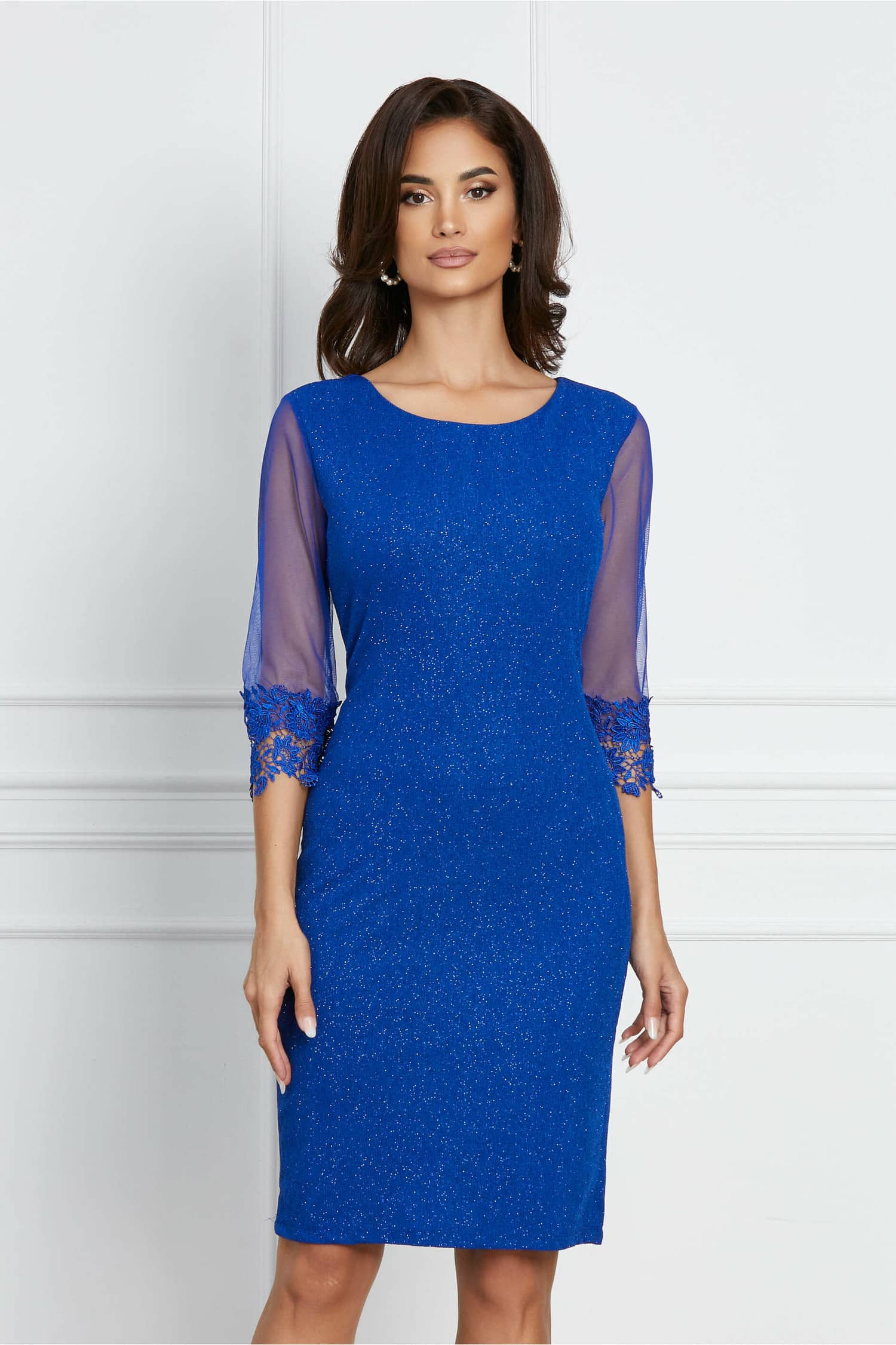 Rochie Andra albastra cu glitter si dantela la maneci