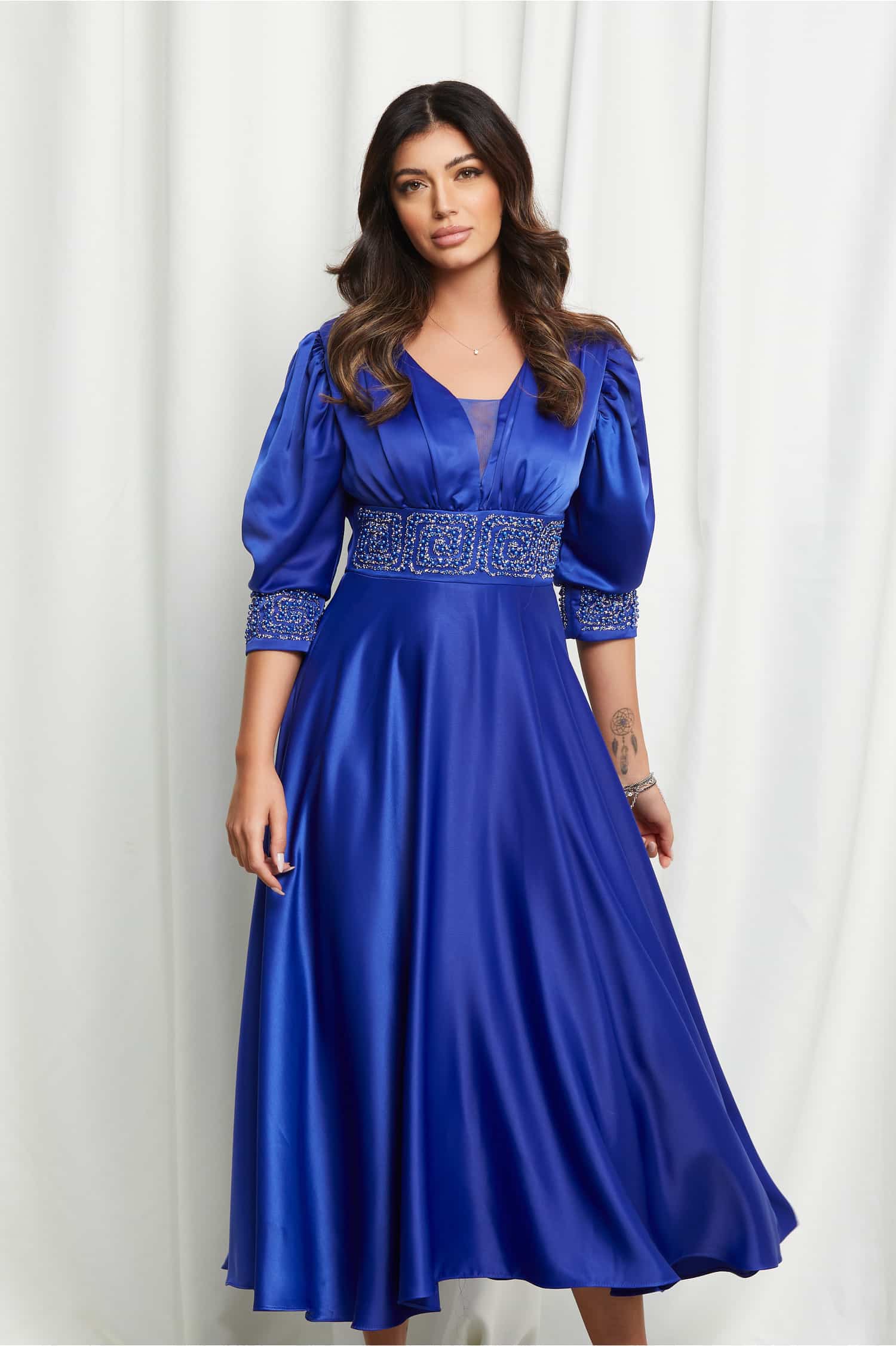 Specification: Rochie Andrada albastra cu strasuri si perlute in talie si la maneci