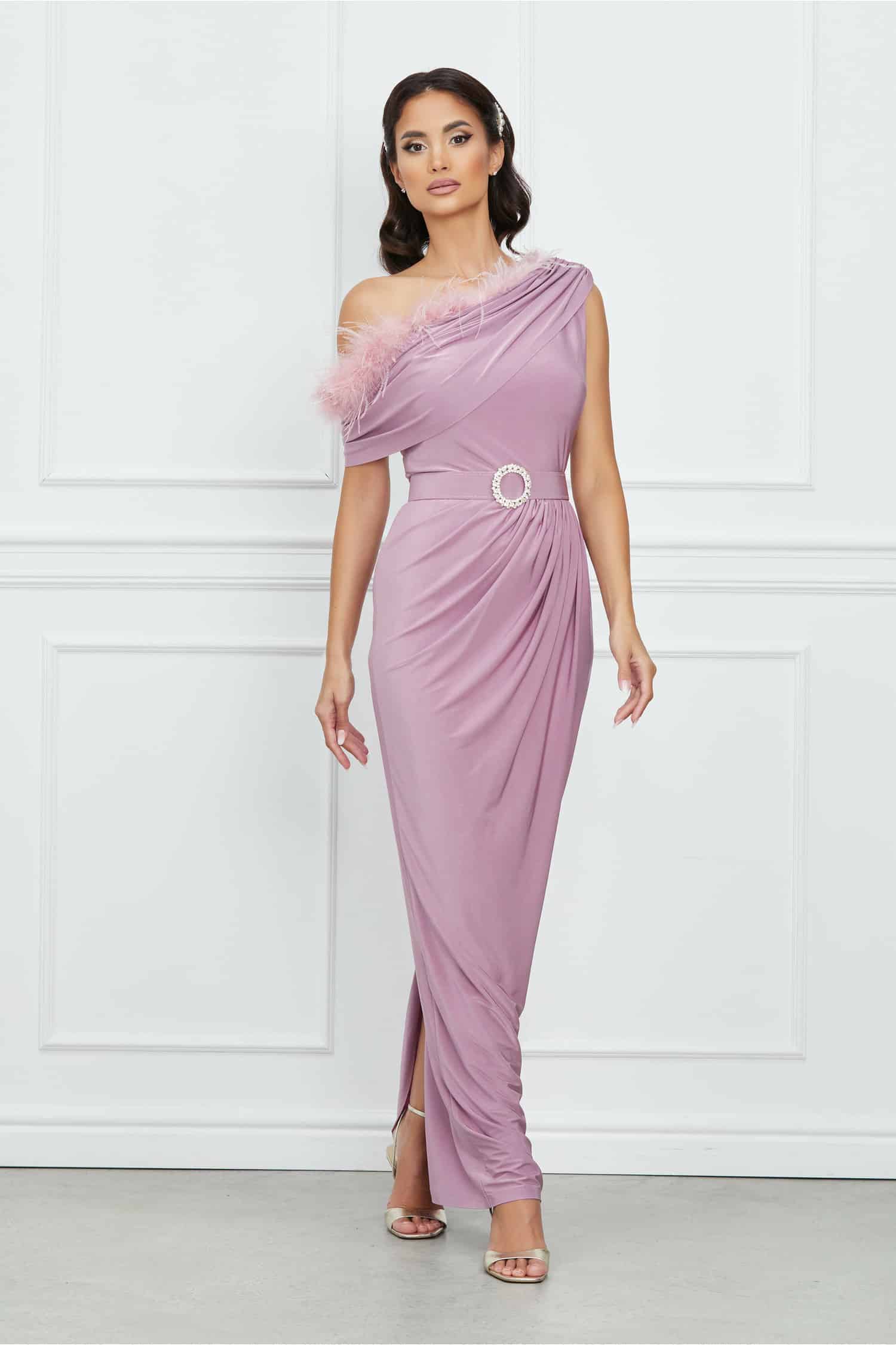 Specification: Rochie Aniela lunga roz cu pene la decolteu si curea in talie